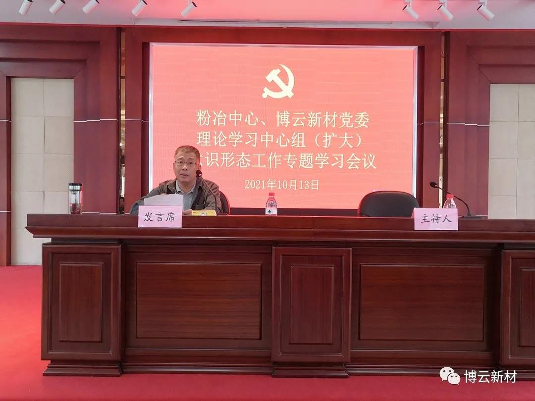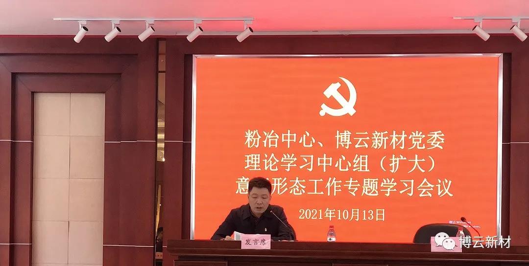 2021年10月13日,粉冶中心、博云新材召开党委理论学习中心组(扩大)意识形态工作专题学习会议。会议深入学习领会习近平总书记关于意识形态工作的重要论述。粉冶中心、博云新材党委书记、董事长贺柳主持会议。粉冶中心、博云新材在家领导及各部门负责人,粉冶中心各控股子公司负责人及各党支部书记参加会议。