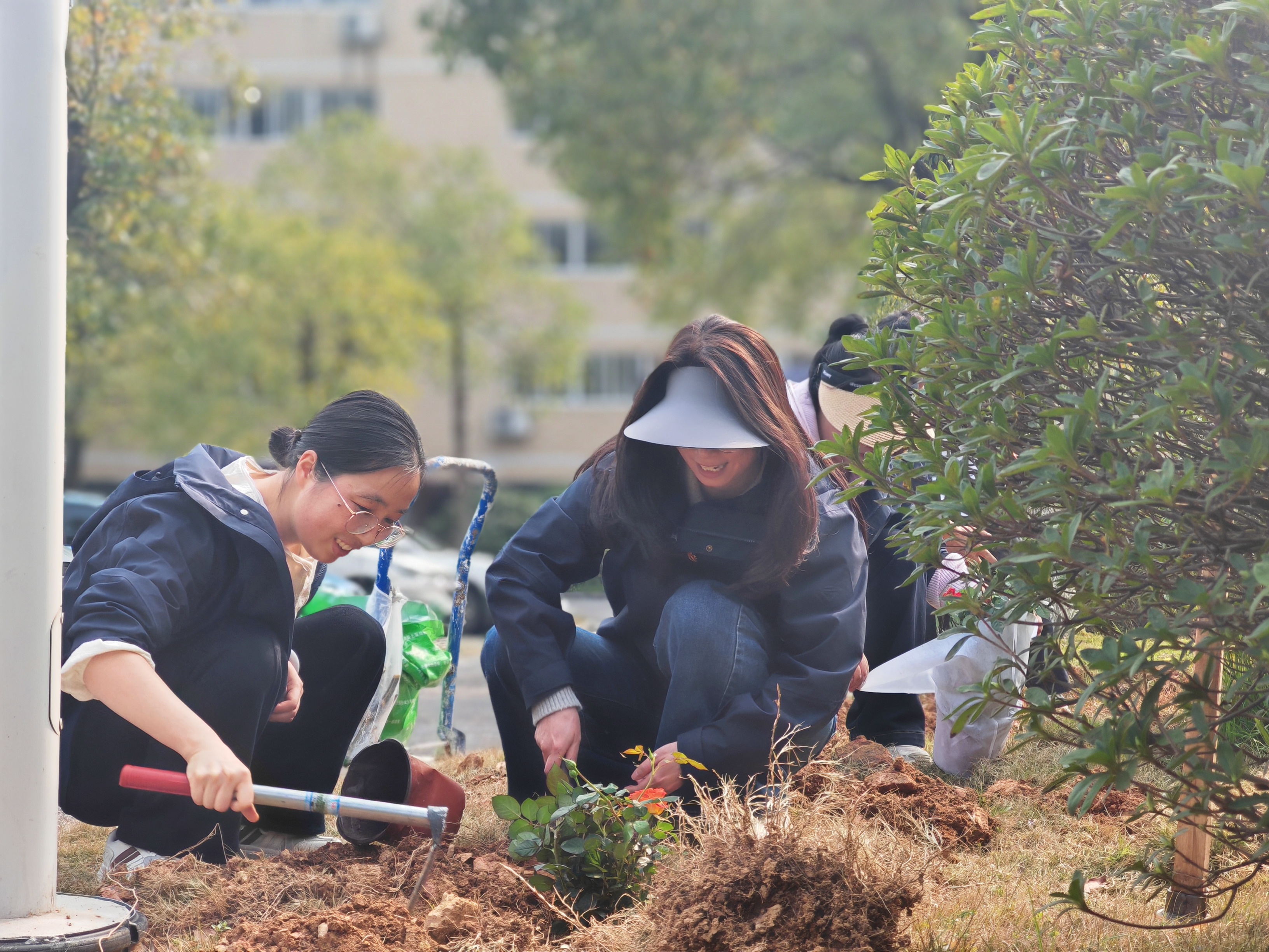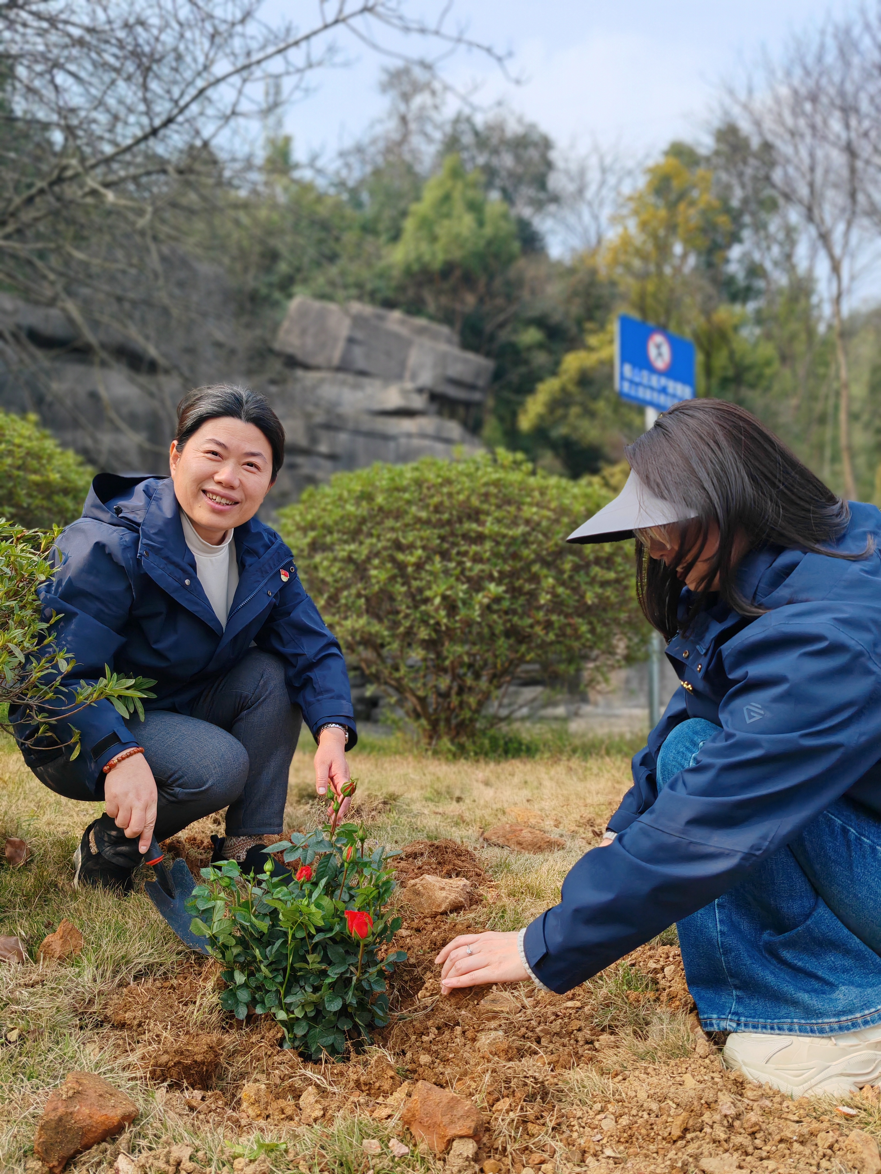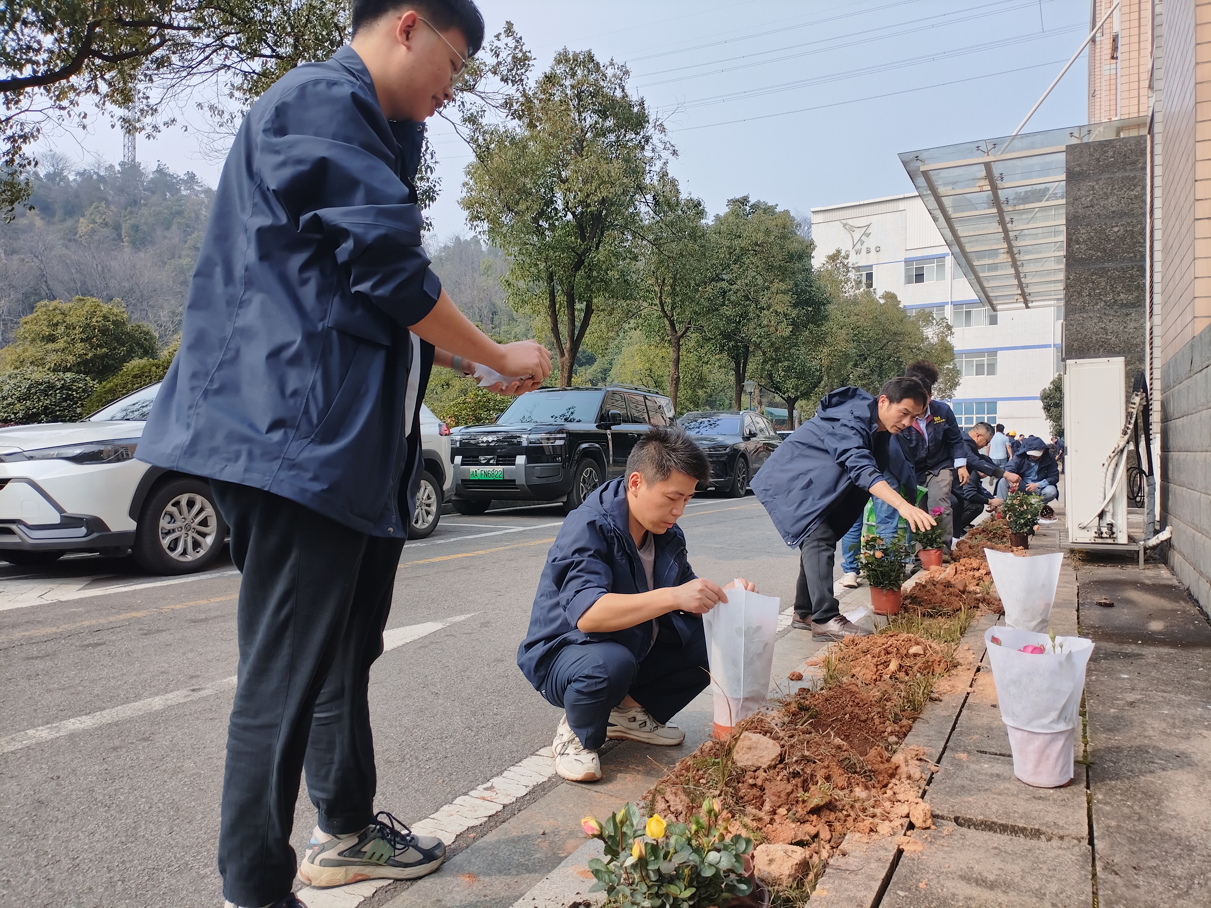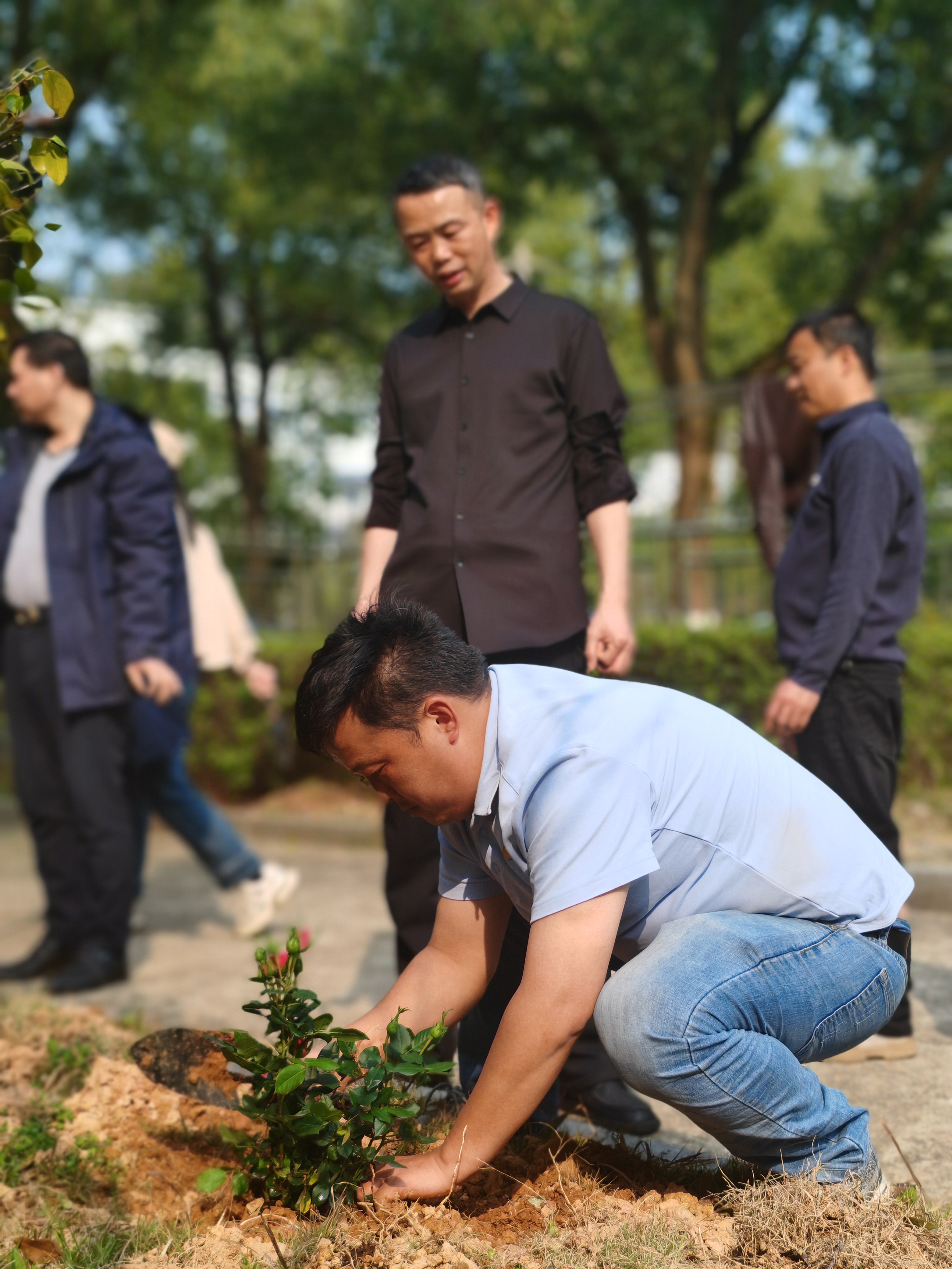 活动中,11个小组充分发挥先锋模范作用,认领种植责任区。在专业园艺师指导下,大家分工协作,挥锹铲土、扶苗填坑、培土浇水,现场一派热火朝天的景象。党旗飘扬在一线,大家干劲十足,有的清理碎石杂草,有的默契配合栽种苗木,有的往返运送水源,每一个环节都一丝不苟。经过共同努力,原本空旷的区域被一株株月季苗覆盖,错落有致的“月季花田”初具规模,为博云公园增添了一道亮丽的风景线。